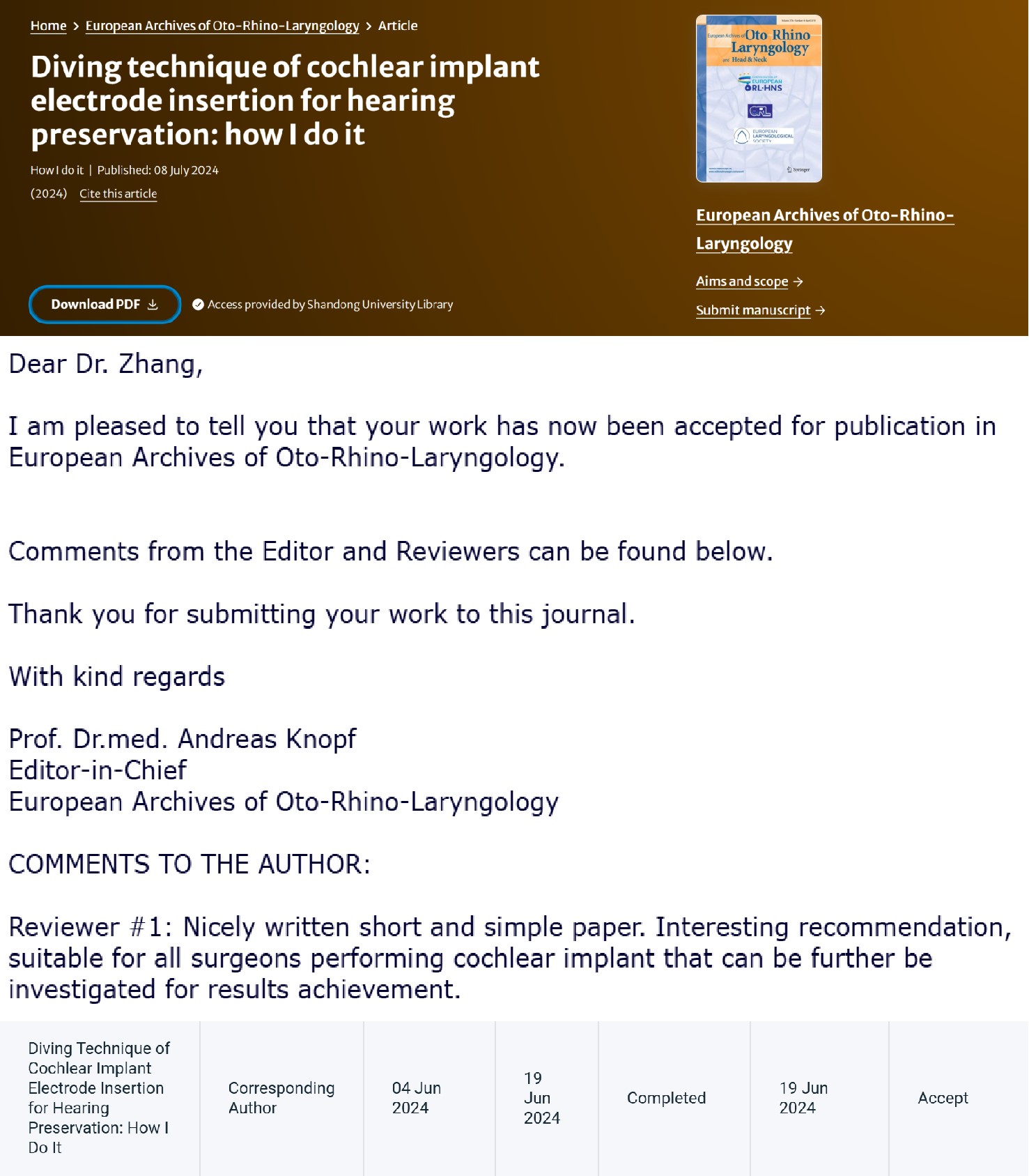 这项新型人工耳蜗植入技术近期发表于European Archives Of Otorhinolaryngology杂志,张志钢教授受邀在国内外学术会议上授课示教。未来,张志钢教授团队将进一步开展临床队列研究,探究“潜水”技术对内耳结构和残余听力保护机制,为这一新型人工耳蜗技术的临床应用和推广提供强有力的询证医学证据,为人工耳蜗术后残余听力的保留提供新策略。