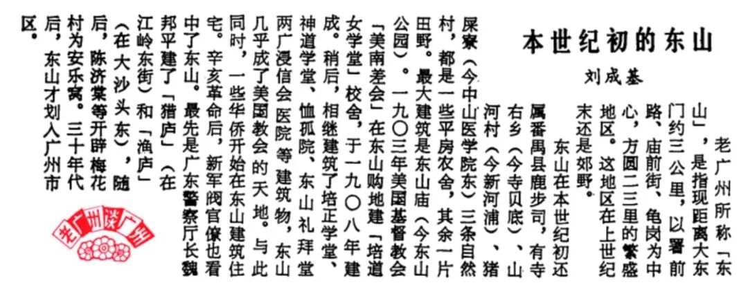 “东山在本世纪初还属番禺县鹿步司,有寺右乡(今寺贝底)、山河村(今新河浦)、猪屎寮(今中山医学院东)三条自然村,都是一些平房农舍,其余一片田野。最大建筑是东山庙(今东山公园)。”《广州日报》1984年4月的旧报上有这样一段关于东山三条自然村的描述,现在依然能在蓝底路牌上找到些许它们的身影。