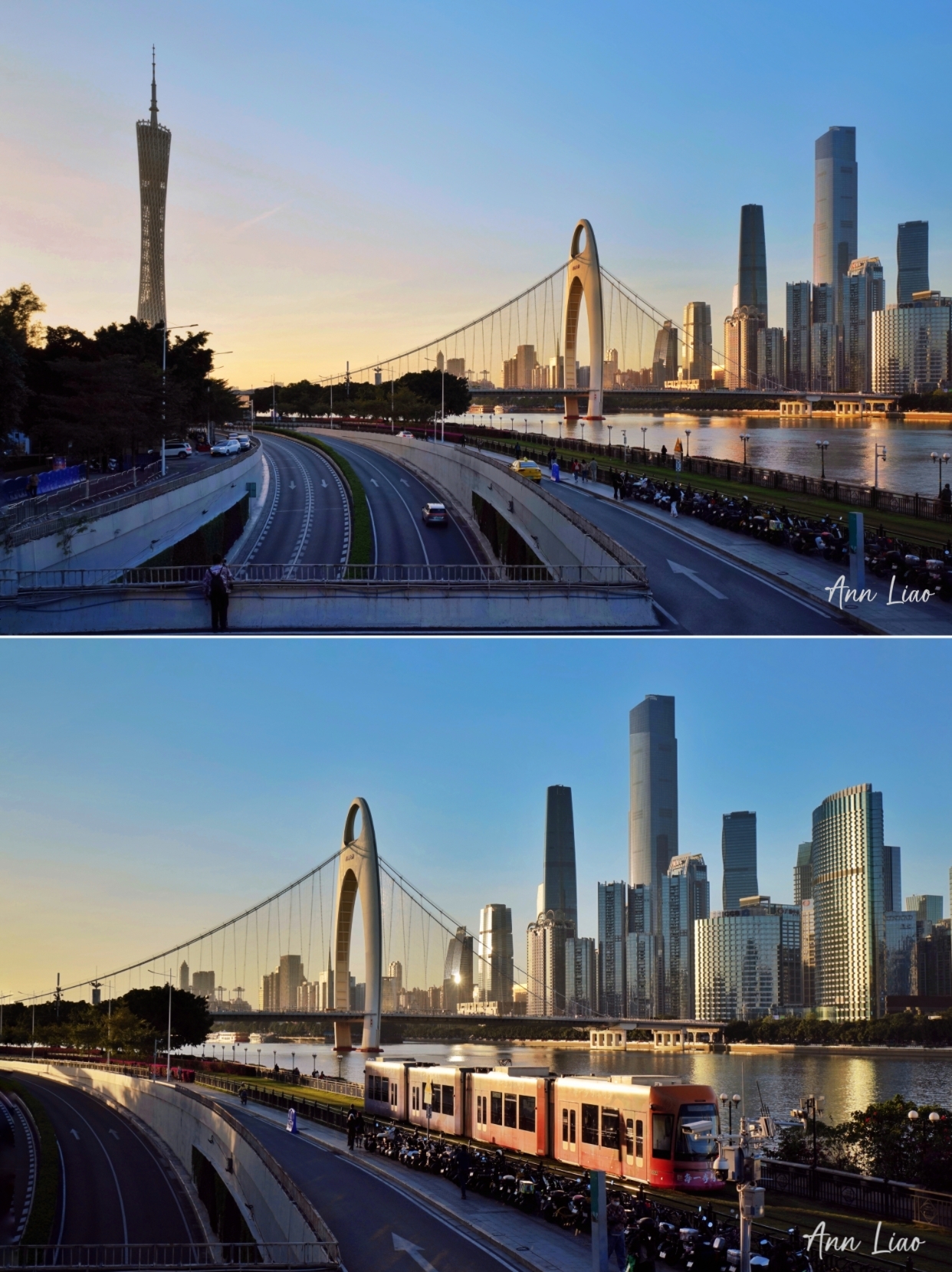 这里是拍日落和晚霞的经典机位,可拍到广州塔、珠江新城CBD、宽阔的江面和游船。南边人行楼梯,可拍到广州塔和有轨电车同框。