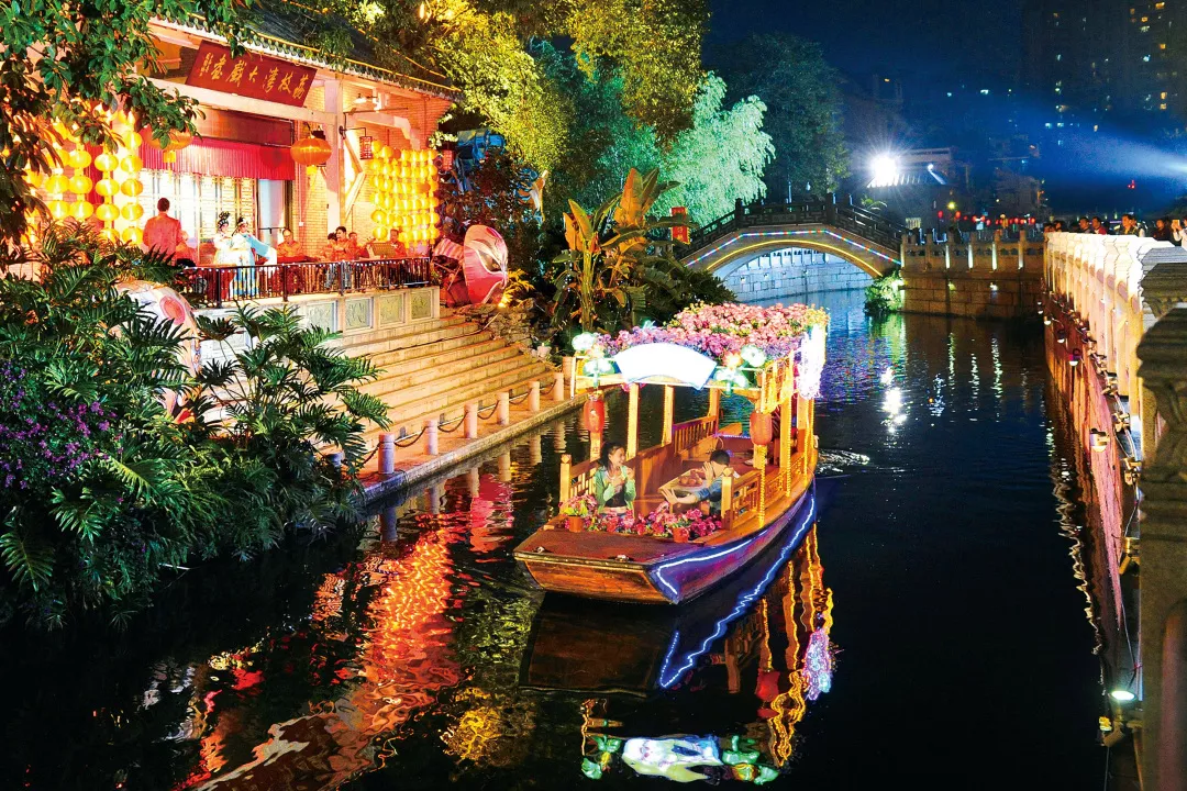 △游人乘花艇夜游荔枝湾涌。晚上的荔枝湾涌别有一番岭南水乡的惬意。广州日报全媒体记者 莫伟浓 摄