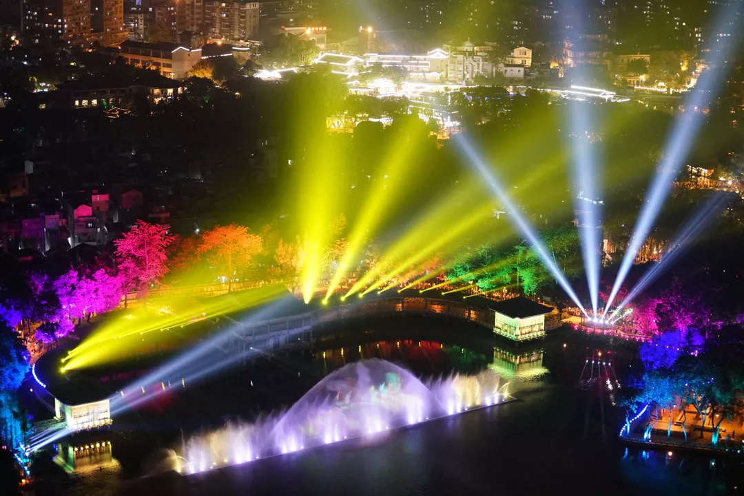 △广州荔湾湖公园,五秀湖海山仙馆前的水幕灯光秀。广州日报全媒体记者 莫伟浓 摄