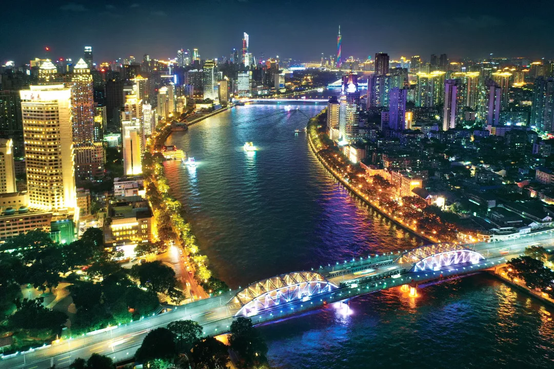 一座城市的夜景,有了水,就有了灵气,有了桥,也就有了生机。夜游珠江,途经广州八座光亮加持的大桥,能看到岸线亮灯40万,犹如银河落珠江。珠江新城上空鸟瞰广州新中轴线,靓丽的标志建筑群以及广州塔尽收眼底,呈现一幅令人心醉的璀璨景观。