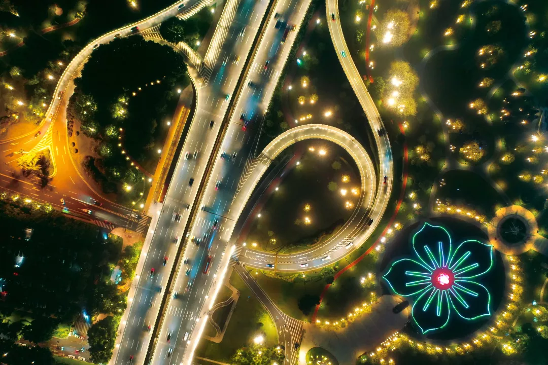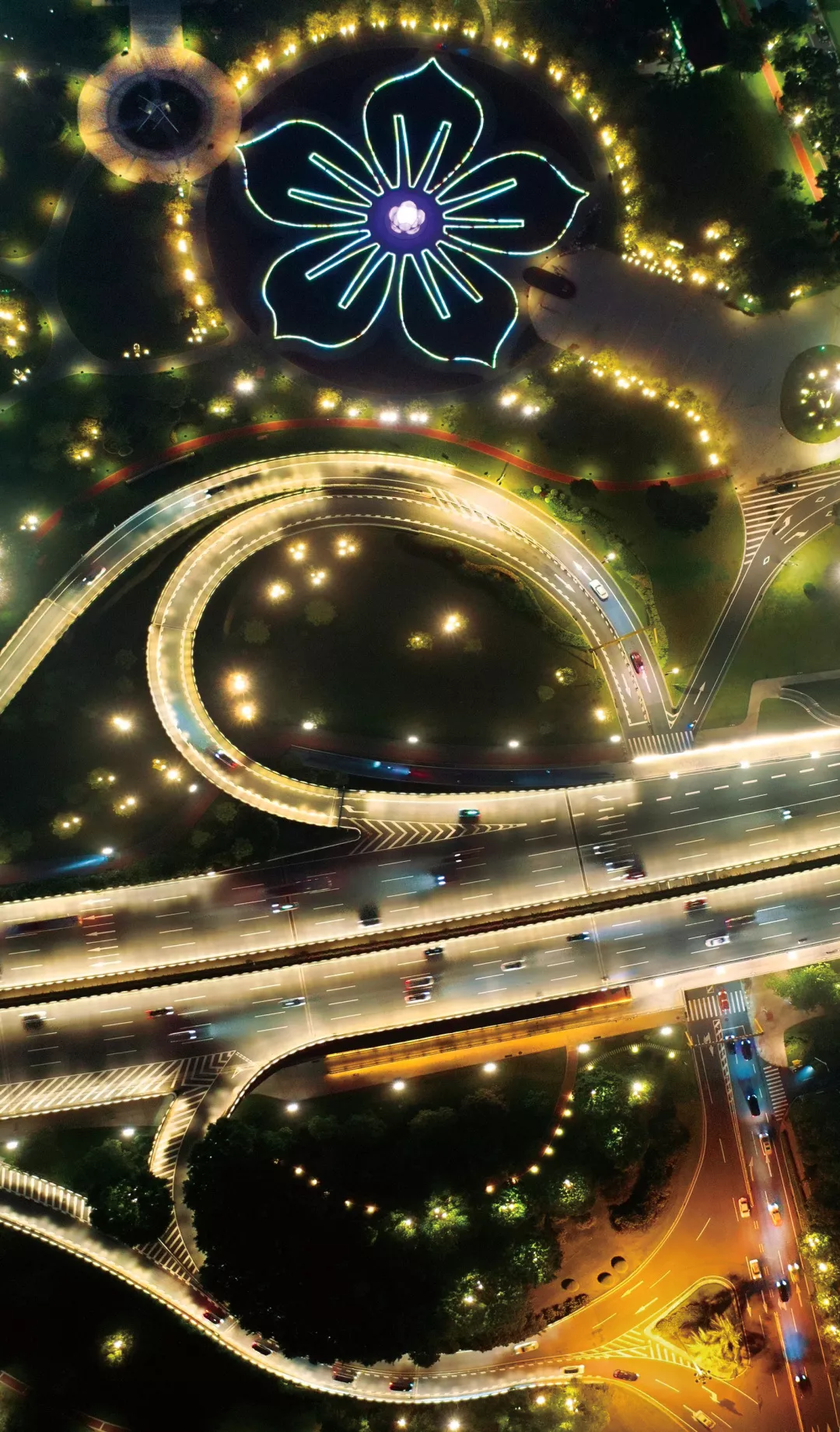 △广州大桥二沙岛段,环形伸展的匝道与艺术公园上的木棉花装饰在夜色里构成一幅如梦似幻的绚丽画卷。广州日报全媒体记者 莫伟浓 摄