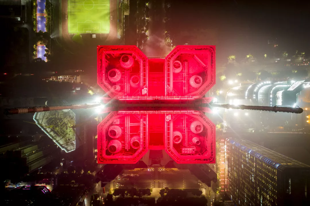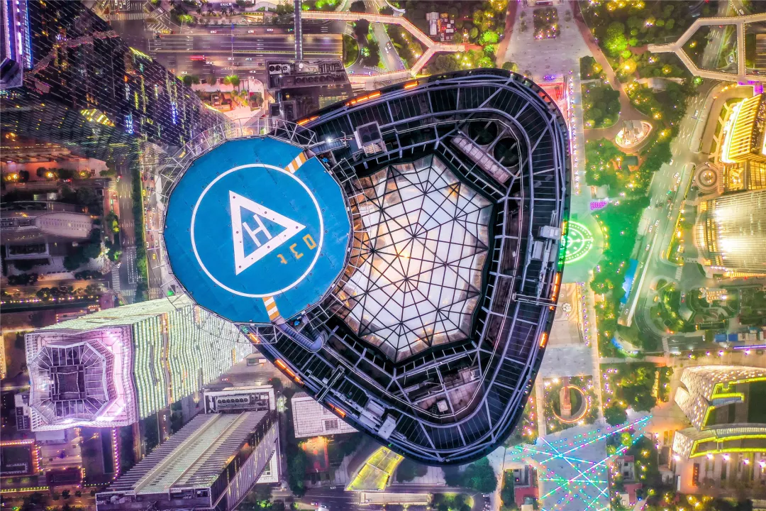 △空中垂直俯瞰中信广场,红色楼顶宛如一朵红花。广州日报全媒体记者 苏俊杰 实习生 廖明璨 摄