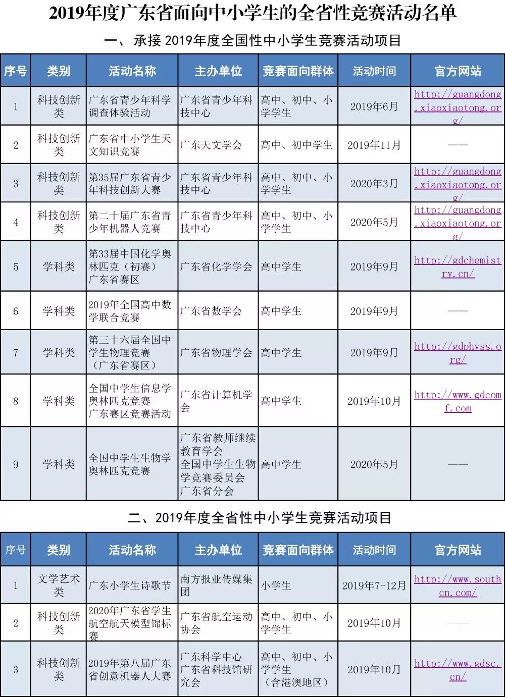 信息时报讯(记者 孙小鹏 通讯员 粤教宣)日前,广东省教育厅公布了2019年度面向中小学生的全省性竞赛活动名单。经自主申报、专家评审和公示等程序,确定广东省青少年科学调查体验活动等18项竞赛为2019年度面向我省中小学生开展的全省性竞赛活动。