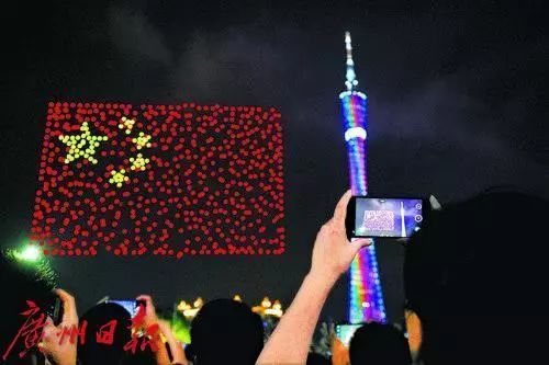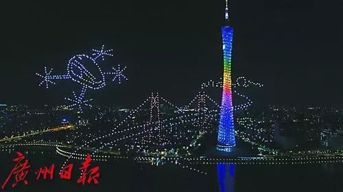 广州花城广场,999架无人机组成的编队与“小蛮腰”及周边楼体灯光秀配合,共同点亮花城夜空。