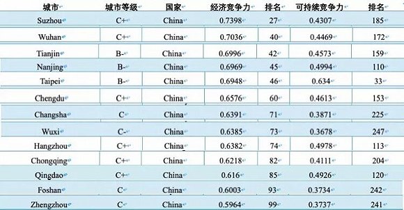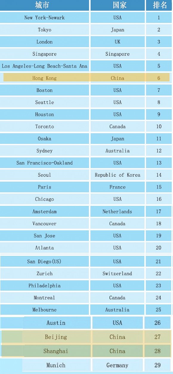 经济竞争力:中国五城进入TOP20