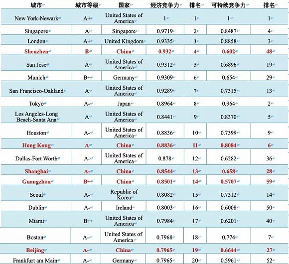 2018年全球城市经济竞争力指数二十强:纽约、新加坡、伦敦、深圳、圣何塞、慕尼黑、旧金山、东京、洛杉矶、休斯顿、香港、达拉斯、上海、广州、首尔、都柏林、迈阿密、波士顿、北京和法兰克福。