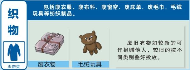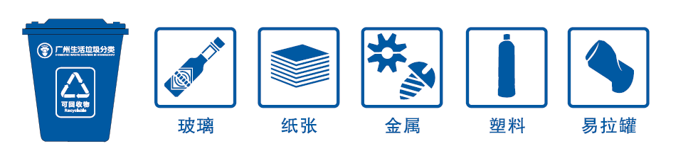 可回收物,是指适宜回收和资源利用的生活垃圾,包括纸类、塑料、金属、玻璃、木料和织物等,要放进蓝色垃圾桶。