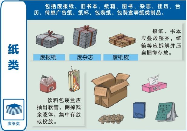注意:报纸、书本应叠放整齐,纸箱等应拆解并压扁捆绑存放,饮料包装盒应抽出软管,倒掉残余液体,集中存放或投放。