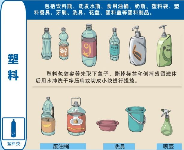 注意:塑料包装容器先取下盖子,撕掉标签和倒掉残留液体后用水冲干净压扁投放。
