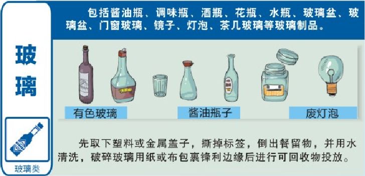 注意:破碎玻璃用纸或布包裹锋利边缘再投放。