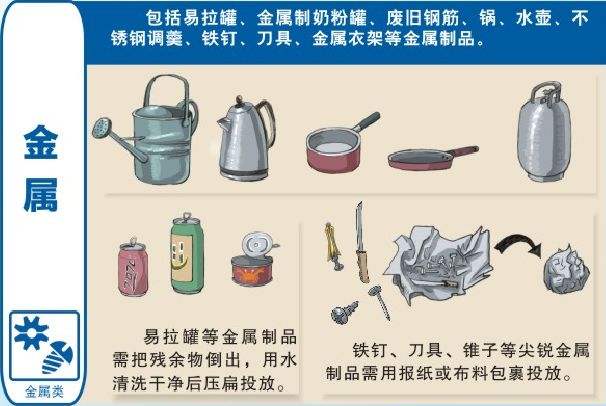 注意:尖锐金属需用报纸或布料包裹投放。
