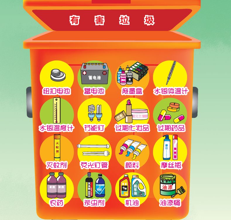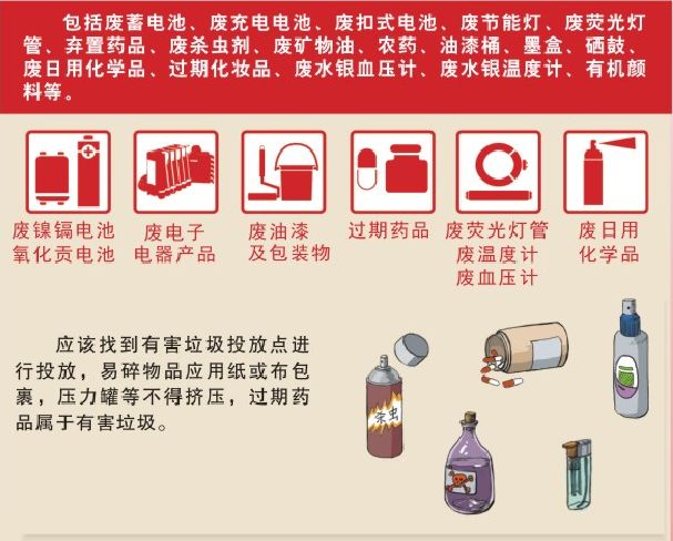 有害垃圾,是指对人体健康或者自然环境造成直接或者潜在危害的生活垃圾,包括废充电电池、废扣式电池、废灯管、弃置药品、废杀虫剂(容器)、废油漆(容器)、废日用化学品、废水银产品等,要放进红色垃圾桶。