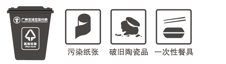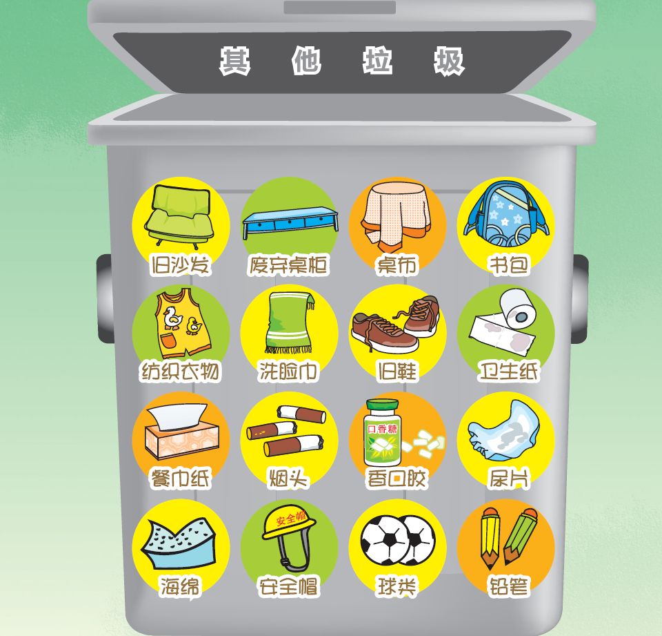 其他垃圾,是指除可回收物、有害垃圾、餐厨垃圾以外的混杂、难以分类的生活垃圾,包括废弃卫生巾、一次性纸尿布、餐巾纸、烟蒂、清扫渣土等,要放进灰色垃圾桶。