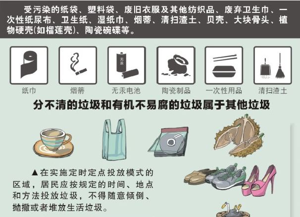 注意:一次性电池、贝壳、榴莲壳、大骨头、受污染的衣物等都属于其他垃圾。