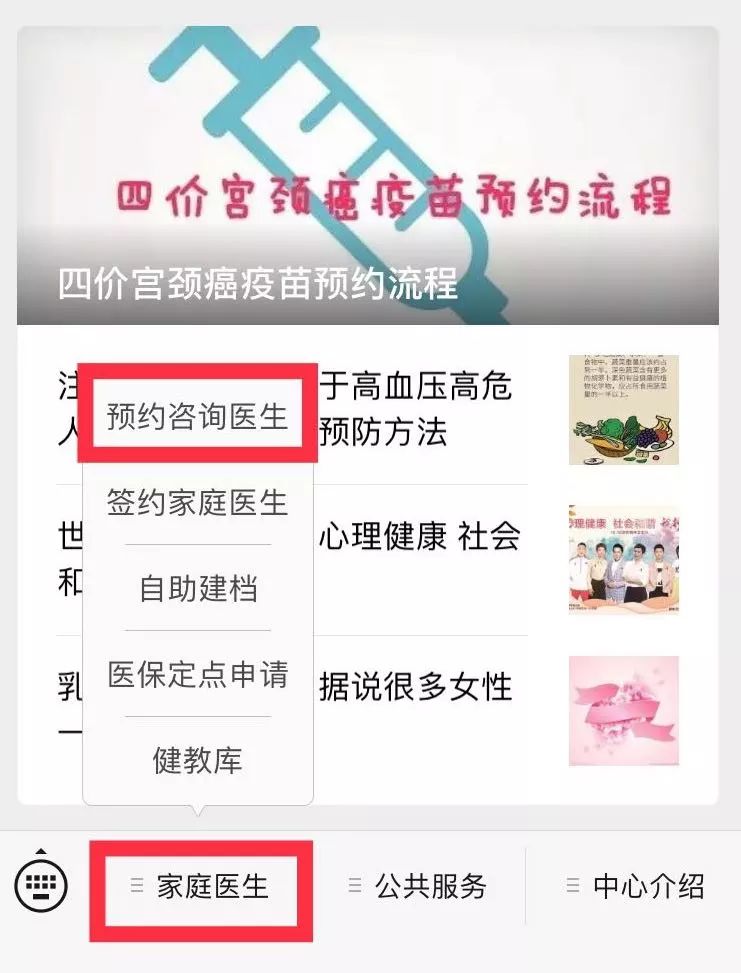 关注天河区新塘街社区卫生服务中心”微信公众号,点击主菜单栏中“家庭医生”,选择“预约咨询医生”。