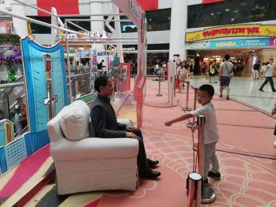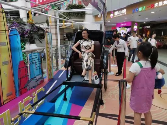 在正佳广场的5楼,小e看到,这里有趟“微缩大湾区”高铁专列,深圳、香港、澳门、佛山……这是一列由广州作为火车头的高铁列车,有香港、澳门、佛山等粤港澳10个城市车厢。车厢内,是每个城市的地标、人文展现。漫步在这个“微缩版”城市园区,不仅可以打卡地标,更能认识5个特别的“乘客”,来自帷幕开啦蜡像馆的知名蜡像:孙中山、阮玲玉、摄影师、一对亲家。这些蜡像作品神形兼备、栩栩如生。