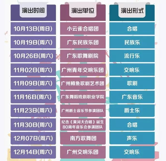 作为广东省文化和旅游厅与越秀区政府联合打造的文化惠民品牌,本届音乐季继续实施“免费入场”的形式,音乐会的门票将会以现场派发和网上抢票的形式免费提供给广大市民,每场共有1000个坐垫。本周末10月26日(星期六下午4:00-5:20)将要上演的是广东歌舞剧院演绎的流行乐音乐会。