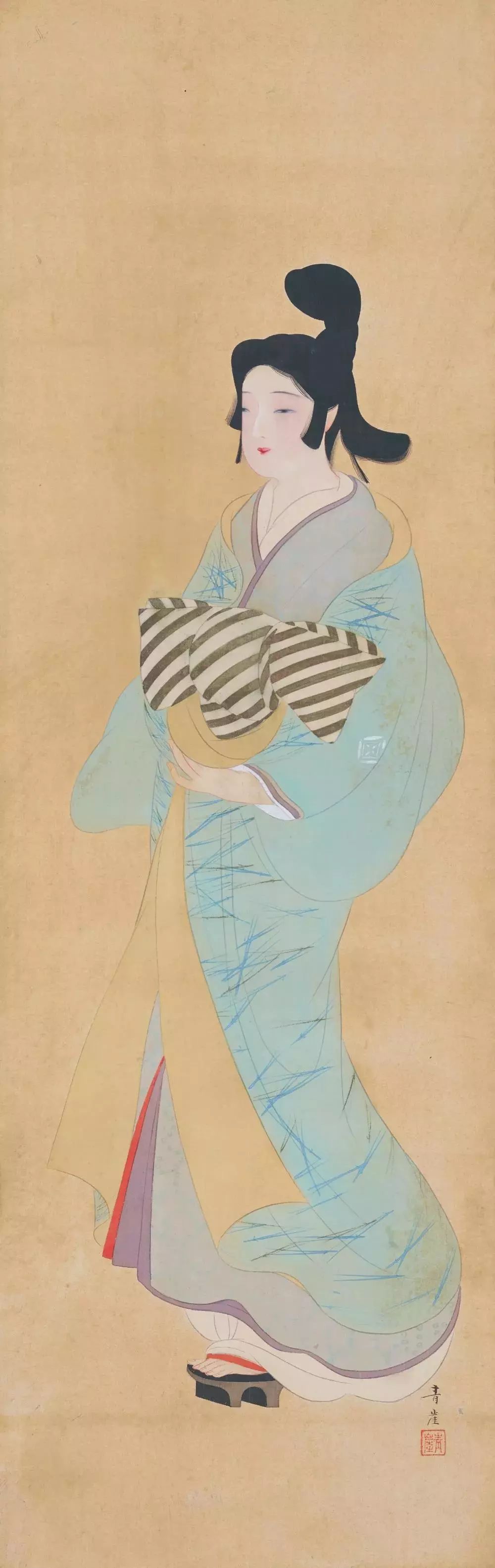 日本美人画在17世纪江户时代开始盛行于各个阶层,既有请画师独家定制的绢本设色美人画,也有在街角书屋贩售的雕版印刷美人画。然而,不同于我国隋唐的宫廷仕女图或明清的上流阶层妇女像,日本的美人画主要突出的是人物的发型与衣着,重点表现当时追崇的时尚,通过细密的服饰图案彰显画师的精湛技艺。此次展览展示包括山下青崖《仕女图》在内的数件日本美人画,有光丰《汲水侍女》、佚名《香园独步》及《踏雪图》。