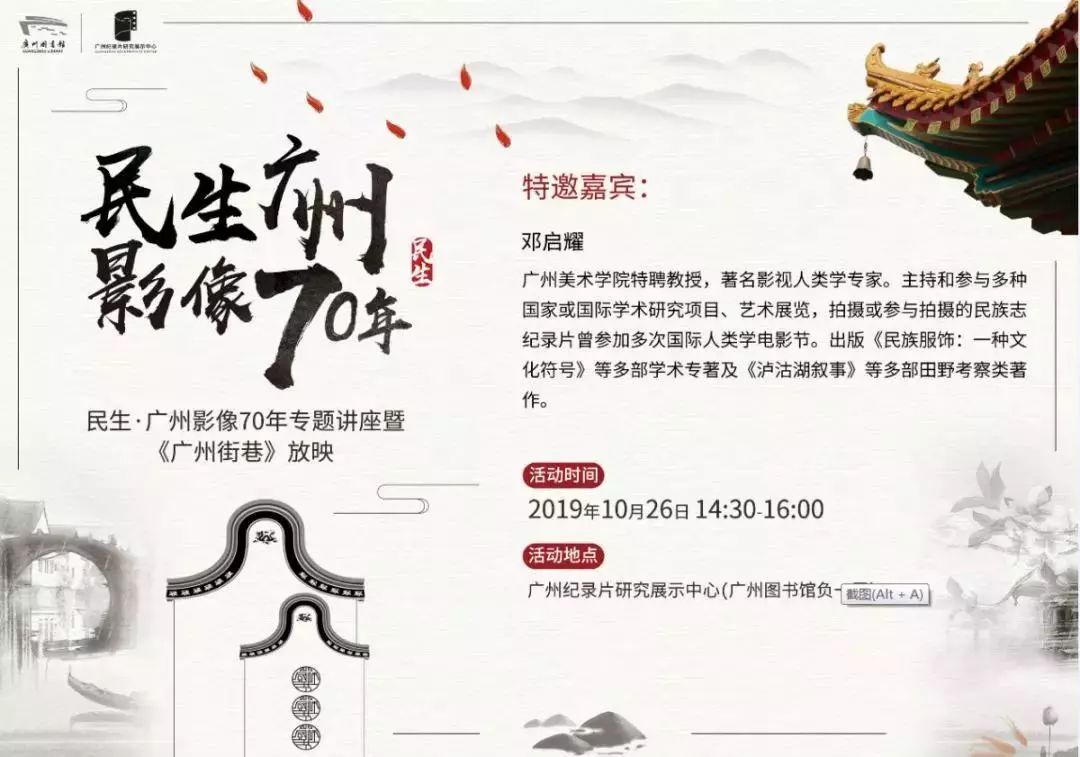“影像广州70年”展览在广州图书馆已经开展近一个月了,前来参观的市民络绎不绝。一张张纪实影像不但记录下了当时广州市民的生活,更是作为一种见证,回顾新中国70载民生变化。广州美术学院特聘教授邓启耀将从影视人类学的角度出发,着眼于“衣食 住行”和观众一起聊一聊70年来广州生活的点点滴滴。讲座前将播放纪录片《广州街巷》。活动无需报名,限座80。14岁以下读者需在家长陪同下观看。
