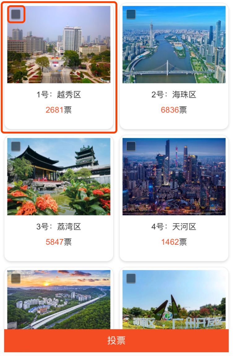 请为【1号:越秀区】投票,图片左上角打勾点击【投票】按钮提交。