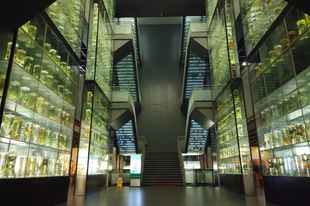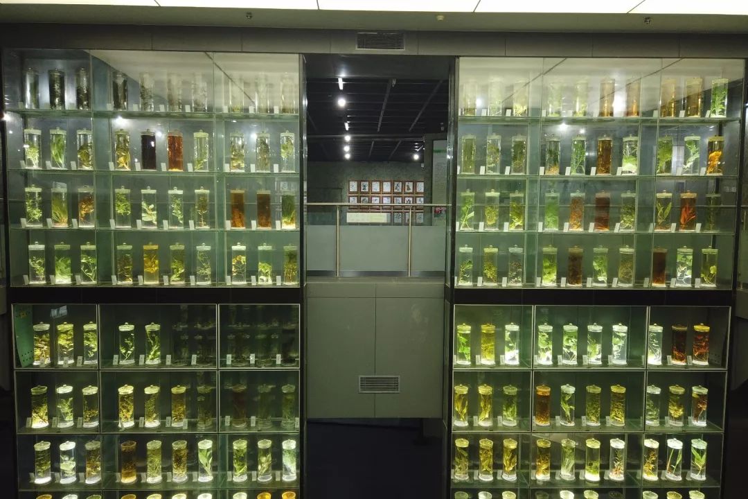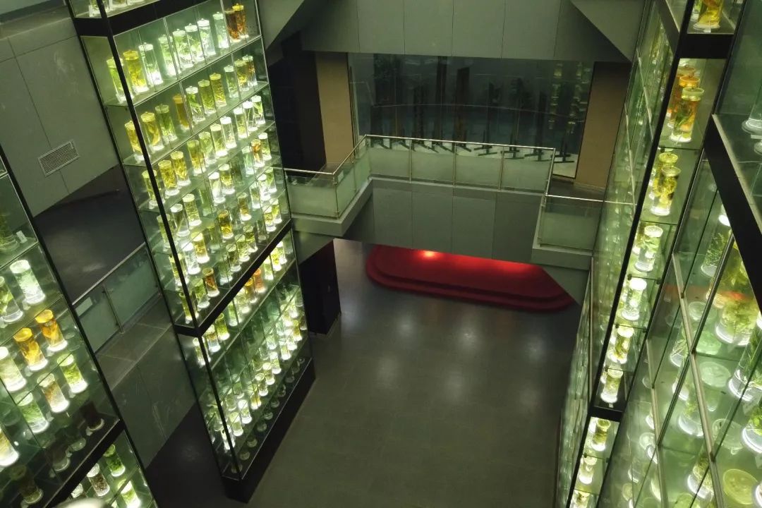 从正门一进去,你就会被4座3层楼高的标本墙震撼——600瓶岭南中草药液浸标本欢迎你。
