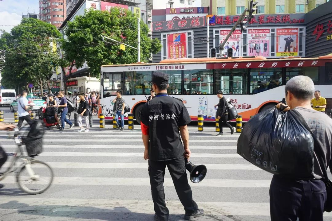 在沙河地区人流最旺盛的先烈东路交濂泉路路口及广州大道北交先烈东路路口,沙河整治办工作人员不时用扩音器提醒来往人员注意交通安全,维护交通秩序。据沙河小e了解到的情况,延续以往双十一期间的工作部署,在街道层面,沙河地区不仅要求街道在编和编外工作人员双十一期间(包括本周末)全部上岗、上街维持秩序,也要求辖内服装批发市场派员负责管理该市场门前秩序,并确保电动车等不允许进入批发市场范围。