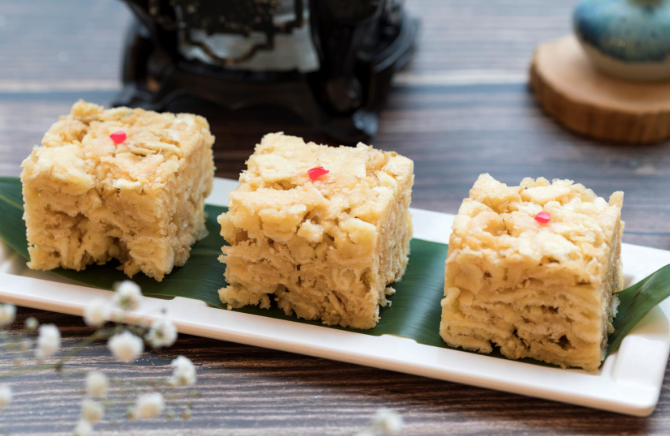 又比如蜂巢芋角,何世晃改制成绿豆蓉角。芋头的淀粉含量变化大,而绿豆蓉的淀粉含量是固定的,这对“起蜂巢”起到关键作用。 在讲解点心制作时,何世晃不停地提到各种物理学或者化学专业名词。他说,点心实际上是各种学科的集合,一个专业的点心师傅必须深入研究点心背后的原材料成分及其在不同加热方式下的变化,方能洞悉原理,真正做到新产品的研发。
