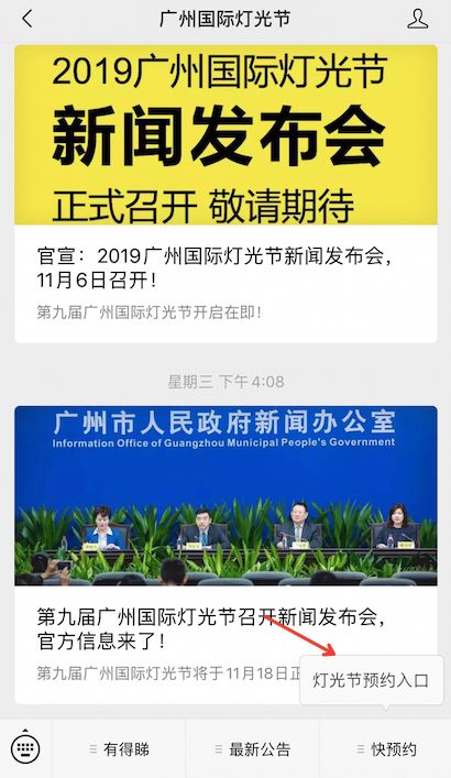 一、可以关注“广州国际灯光节”微信服务号,在对话界面右下角,点击“快预约”按钮下级菜单“灯光节预约入口”,进入预约界面。