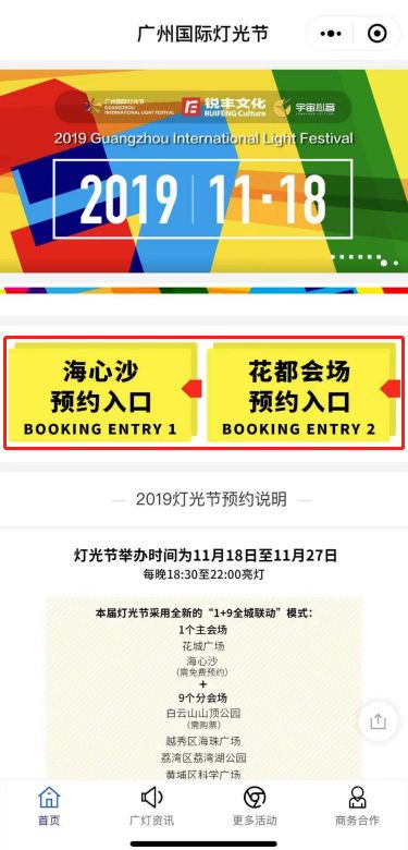 1.今年灯光节不设广州塔灯光秀展示,海心沙作品区域、花都区会场需预约方可进入,预约为免费,未预约游客无法进入游览。