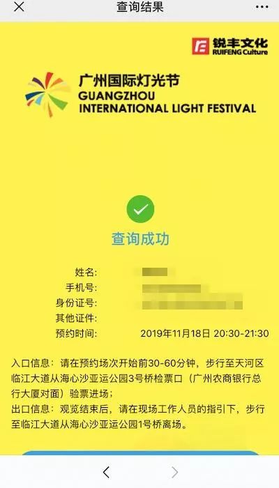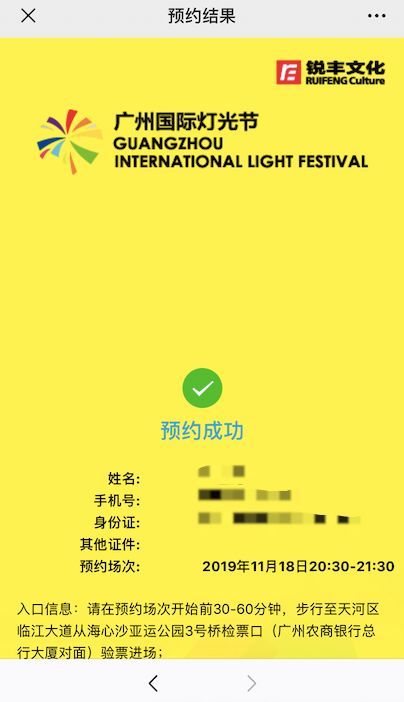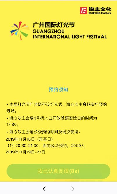 2、花都区预约:需提前24小时进行入场票务预约,即11月17日夜晚19:00前预约11月18日门票,预约名额满后或超过预约时间即停止预约,每晚四场表演(19:00、19:45、20:30、21:15)可供预约,每场人数1200人。届时按照预约场次分批入场参观。