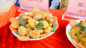 下设3个摊位,邀请越南、新加坡、马来西亚、泰国、印尼等归侨侨眷以3-4人为组制作地方特色美食,如艾糍、春卷、凉拌米线、咖喱鸡、肉骨茶。参加“套圈”“钓鱼”游戏就可以获得免费试吃券,早点到早排队、早点吃上不后悔~