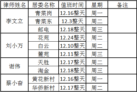 下面是华乐街各社区律师12月值班时间表,