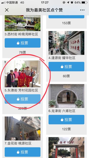 每个微信号每天可投5票,每个社区最多可被投1票。荔湾区最终选出5个社区参加广州市级评选。