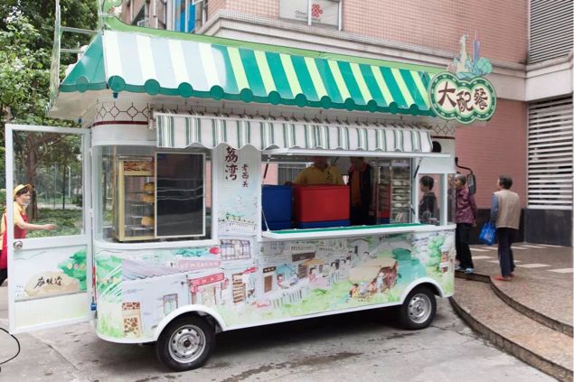 每周一至周五的中午十一点,在东漖街芳村花园配餐点门口都停着一辆西关风情大配餐车,身着黄T恤红围裙的配餐员,将配好的午饭从大配餐车上搬下来,街坊们就自觉排好队,等待领取提前订好的午餐。