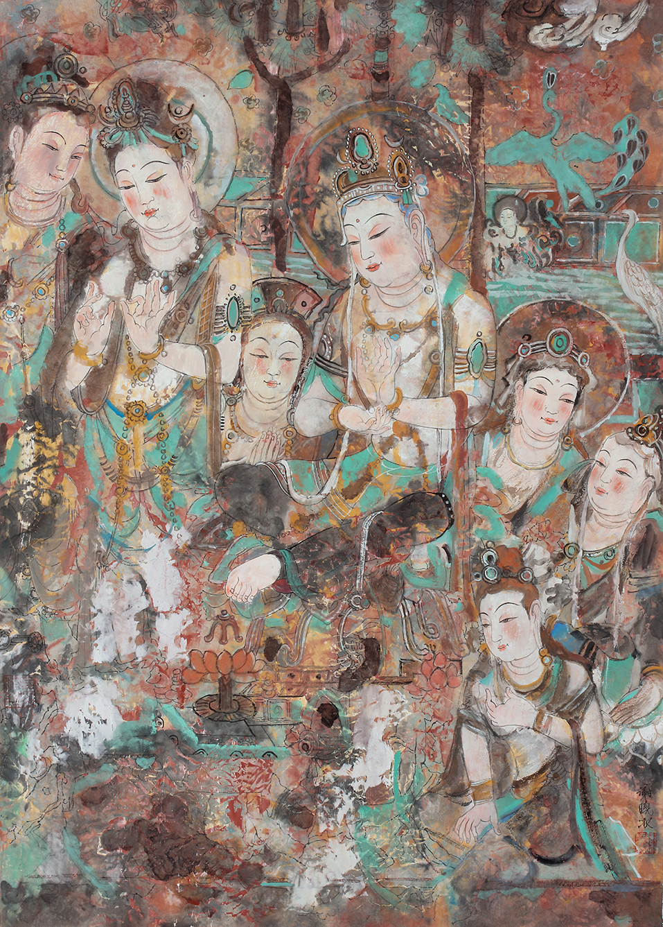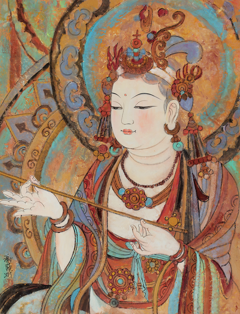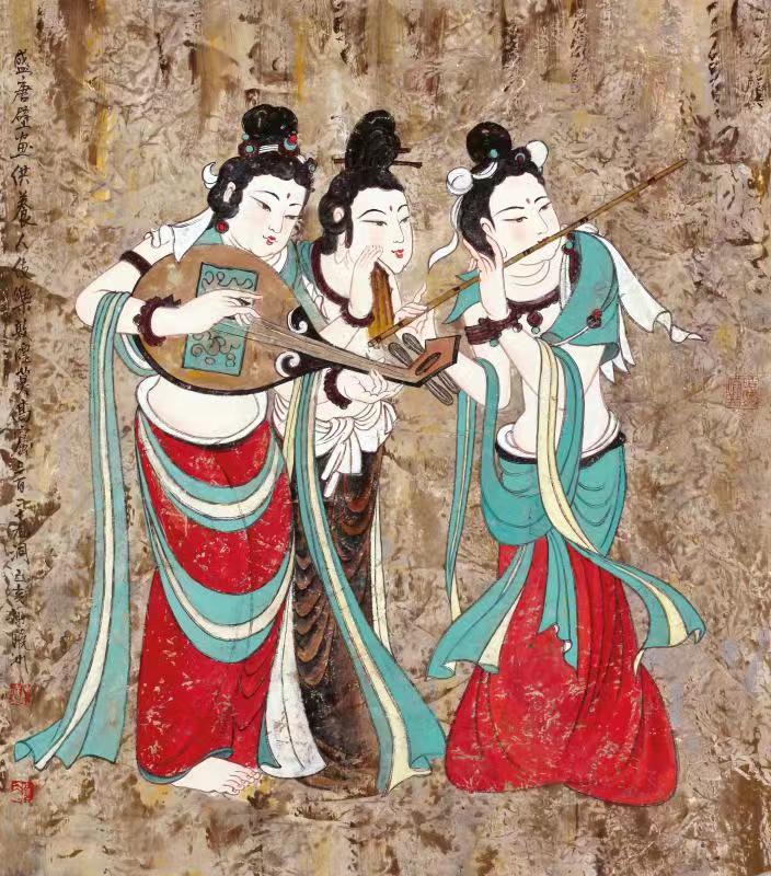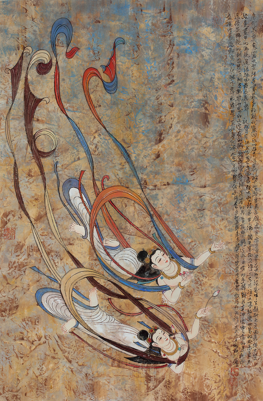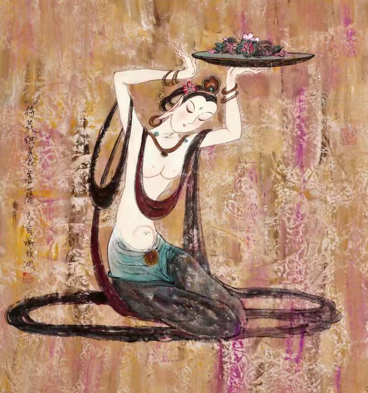 即将展出的“敦煌梦——谢晓冰敦煌壁画作品展”展览中,谢晓冰的这批敦煌题材作品,既源于传统的敦煌壁画艺术,又呈现出异于传统的敦煌壁画的新样式;在风格上,力求回归敦煌的魏韵唐风,既取北魏壁画造型雅拙、色彩单纯的特点,也取隋唐雍容华贵的装饰画风,线描与晕染并重,突出了类色彩的明暗深浅层次,构成一种整体庄重的宗教氛围。融佛的慈祥、菩萨的端庄美好于一体,传达出新的意味。他说“我笔下的佛陀、观音及供养菩萨,都在充分表现出佛相的庄严、肃穆、圣洁与祥和,营造一种古朴斑驳与庄重典雅的画面气质,进而达到一种古老与现代、神秘与梦幻的境界。”