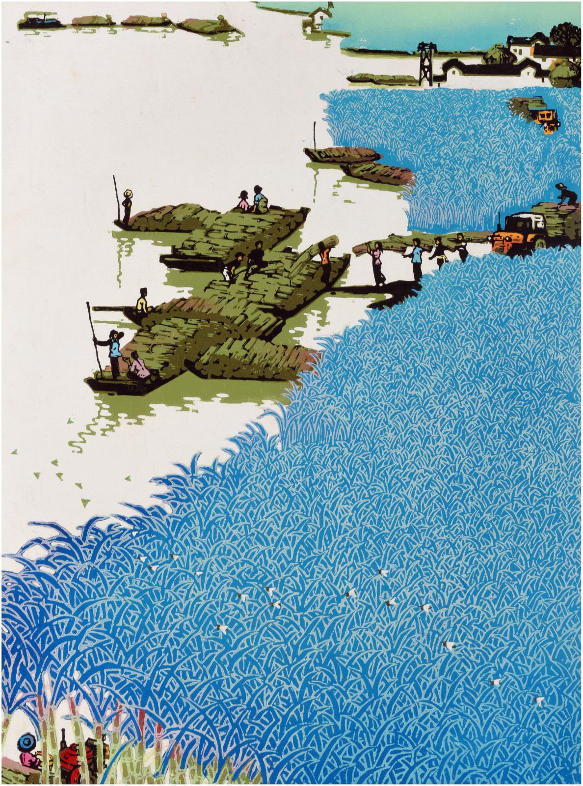 1974年,许川如创作出了经典作品《甜遍江南》。在这件描写丰收画面的作品中,他“破天荒”地以甘蔗田青纱帐的翠蓝来替代传统意义中象征丰收的火红与金黄,这种实验性的表达展现出许川如对传统绘画的发展和对现代性的探索精神。这件作品在1974年就入选“全国美术作品展览(版画展)”,1979年又入选第六届全国版画展,被中国美术馆收藏,并被选送参加“联合国教科文组织”主办的《中国现代绘画艺术展览》,到世界各国巡回展出,同时选为我国驻外使馆及南京长江大桥挂画,可见其受认可程度。