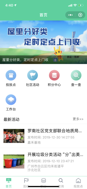 该街还研发了一个小程序,主要功能是站桶签到、记录党员站桶时间、记录垃圾量等,还有一个定时开放的二维码,居民只要到投放点正确投放垃圾,就可以扫码积分换礼物,“这个二维码就是‘新时尚积分银行’,用于鼓励群众积极参与垃圾分类,我们计划与辖内的超市合作,用积分可以在超市换购商品。”均禾街有关负责人说。