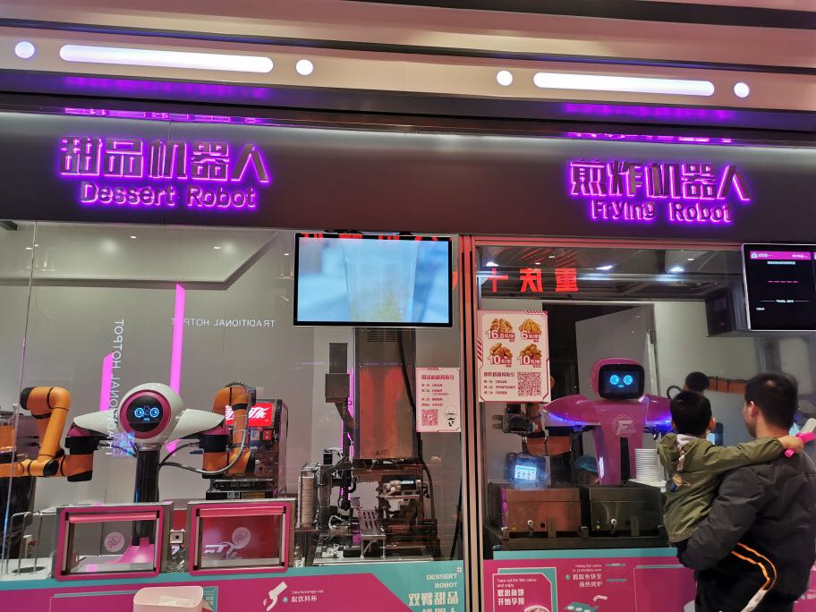 位于珠江新城花城汇的Foodom机器人中餐厅1月12日对外营业。由碧桂园集团的全资子公司千玺机器人餐饮集团自主研发的系列机器人在这里齐齐亮相。据悉,这是全球首个全系统机器人中餐厅。可以看到,由32口炒锅组成的大厨阵容,以透明玻璃墙间隔展现在大家面前,头顶的云轨未来科技感十足,而装饰灯光以及萌萌的甜品机器人、煎炸机器人却是粉色系,科幻钢铁风和粉红少女风融合却达到了奇异的和谐。据悉,整个餐厅目前已投入46台机器人设备作为餐厅运营的核心设备,包括迎宾机器人、双臂煎炸机器人、双臂甜品机器人、双臂汉堡机器人、调酒机器人、双臂煲仔饭机器人、炒锅机器人、云轨系统以及地面送餐机器人。