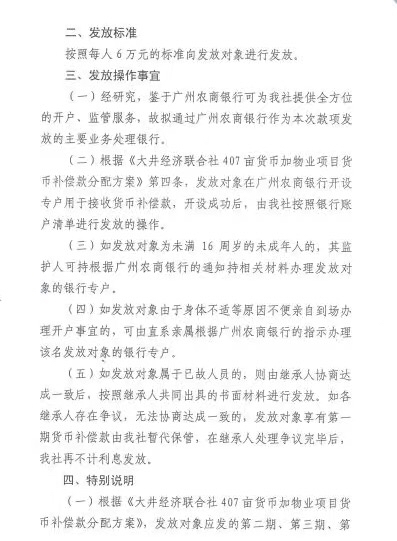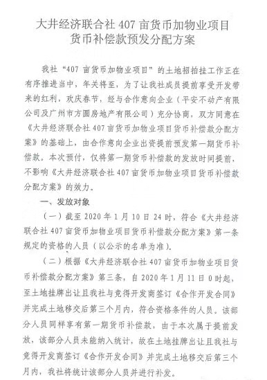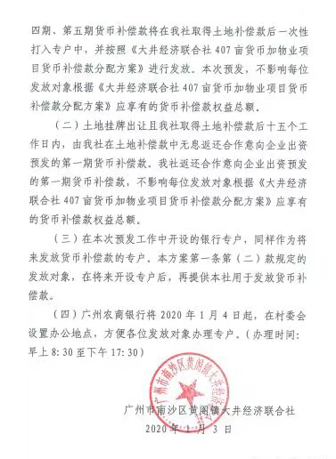 今年1月,南沙黄阁大井村经济联合社407亩货币加物业项目货币补偿款预发分配方案第一期补偿款开始发放,一期每人将可以分得6万元。