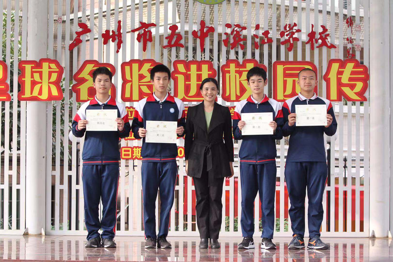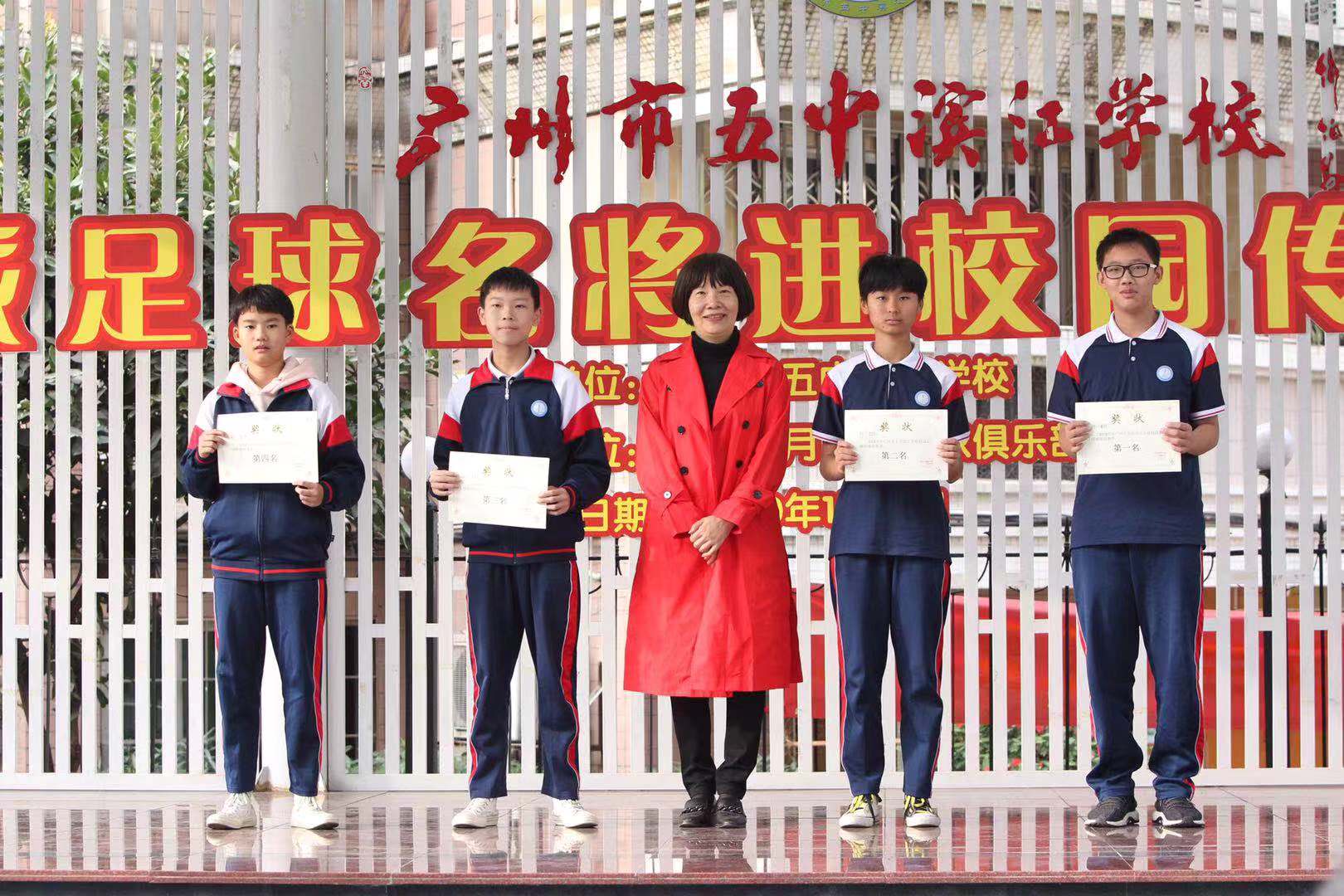 海珠区文化广电旅游体育局副局长丘伊莉为学校班级联赛获奖球队颁奖