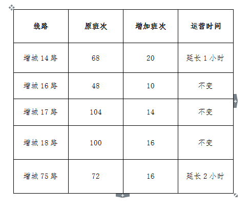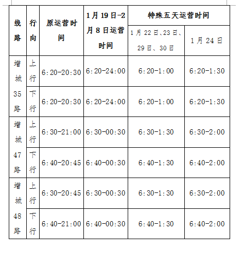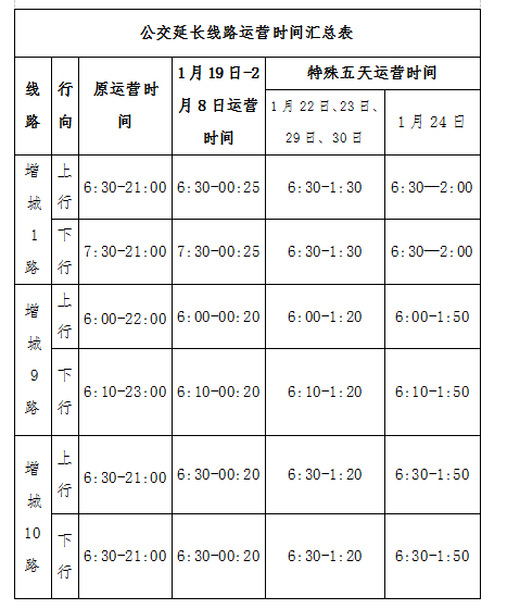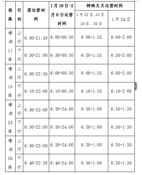 春节期间1月19日至2月8日,增加运力及延长线路运营时间的公交线路共10条,分别为:增城1路、增城9路、增城10路、增城11路、增城15路、增城25路、增城26路、增城35路、增城47路、增城48路,夜间增加班次平均间隔为15-20分钟。同时,增城14路、增城16路、增城17路、增城18路、增城75路增加运营班次缩短班次间隔。具体如下: