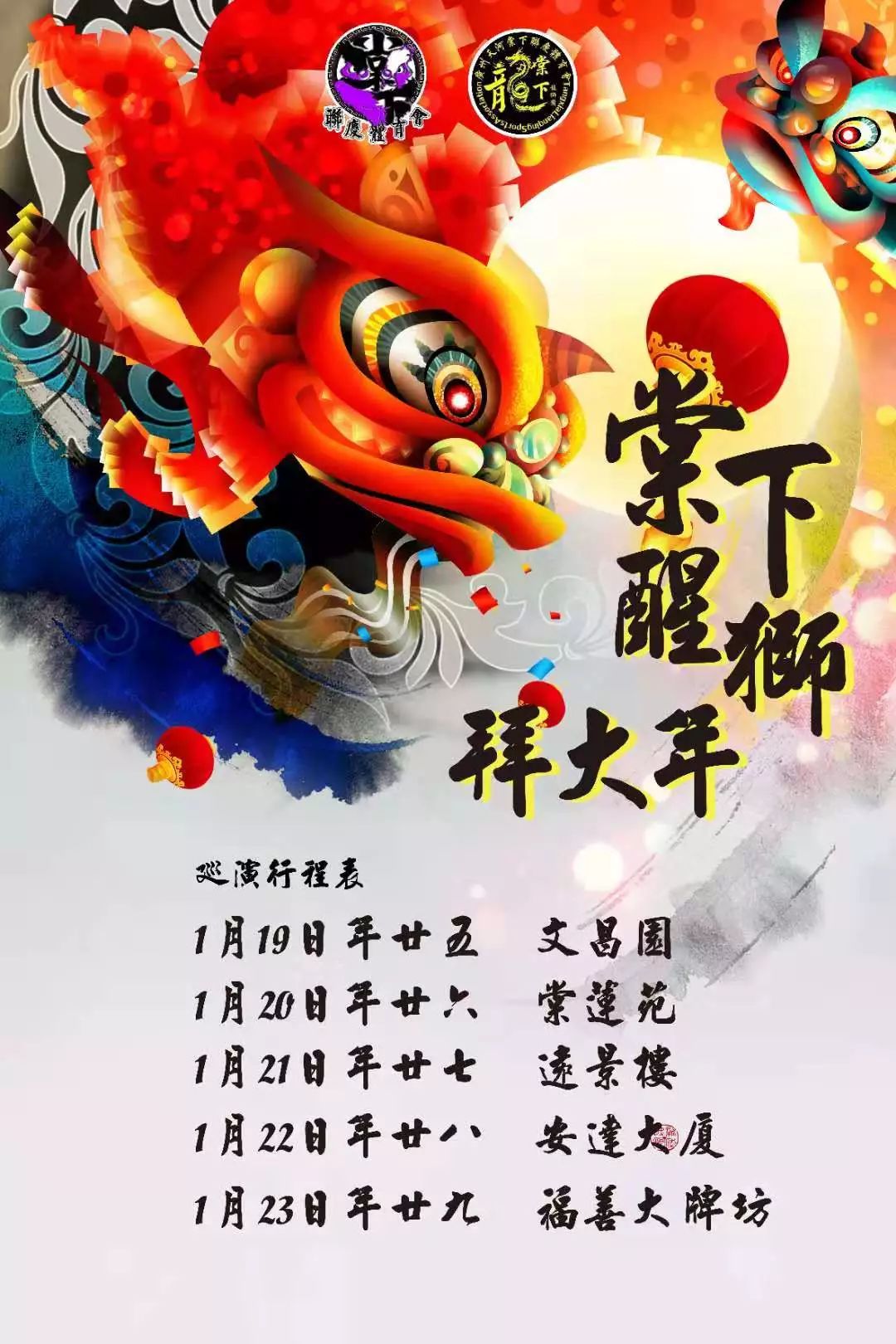 而从1月19日开始,棠下龙狮团将连续五天在在棠下村范围内举行巡回演出,醒狮拜大年,精彩乐不停。小朋友们刻苦练习十天的成果也将在巡演上展示。