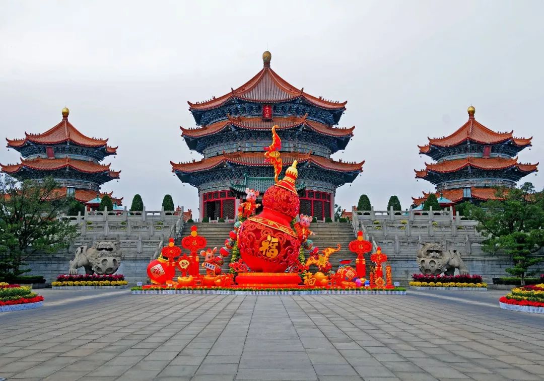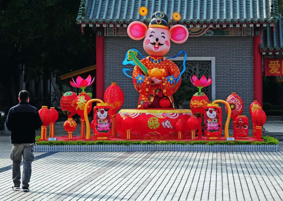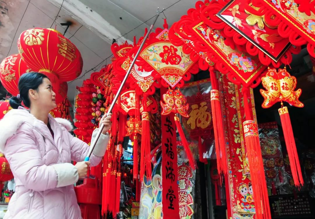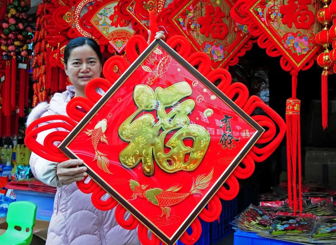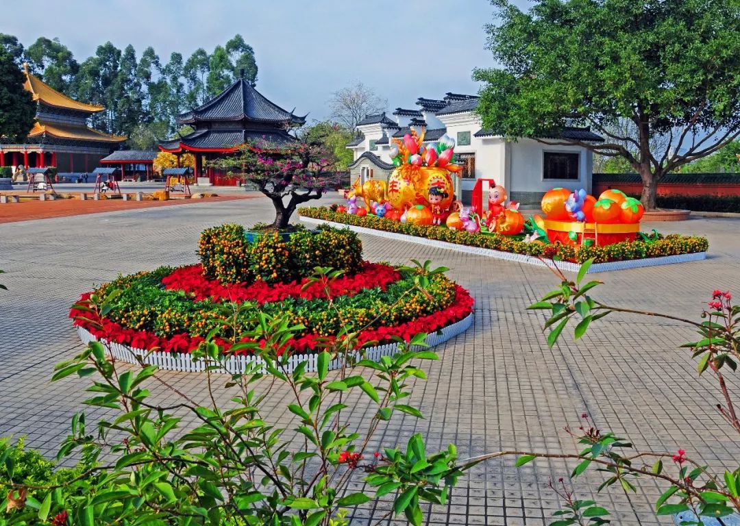 用鲜花、福字、鞭炮等饰品摆设新春景观