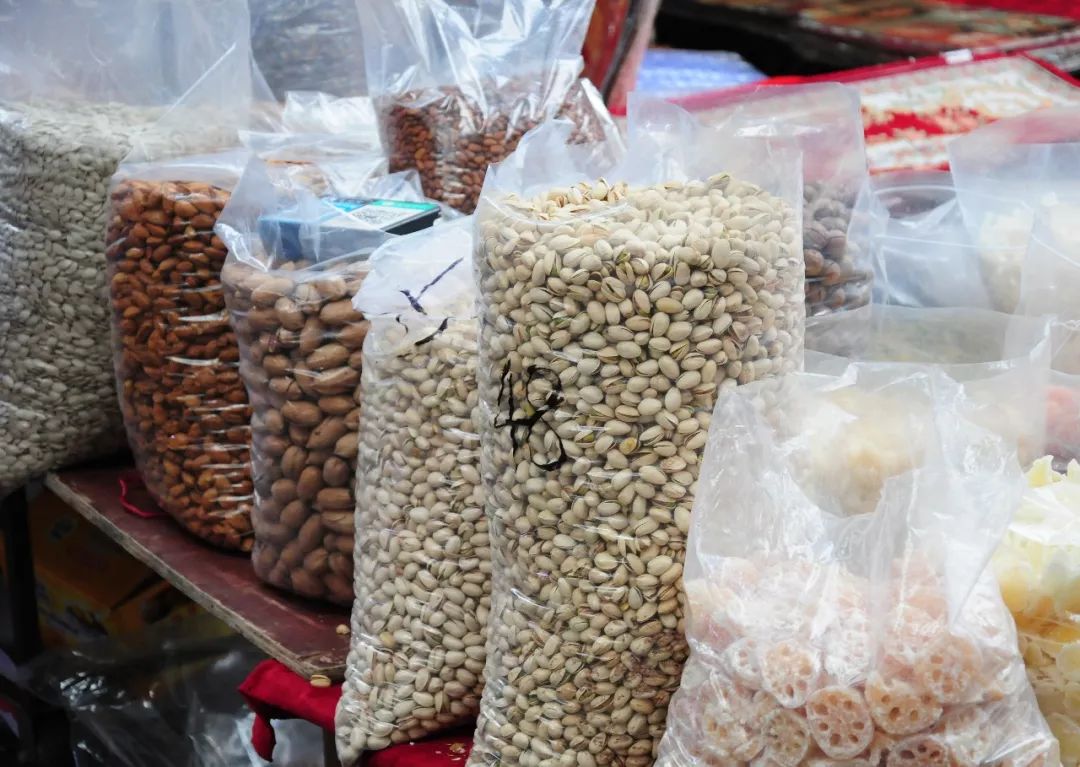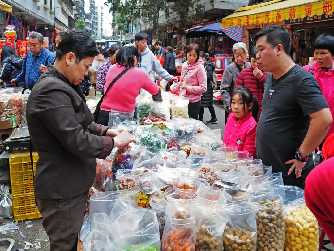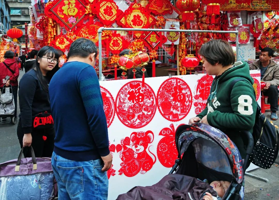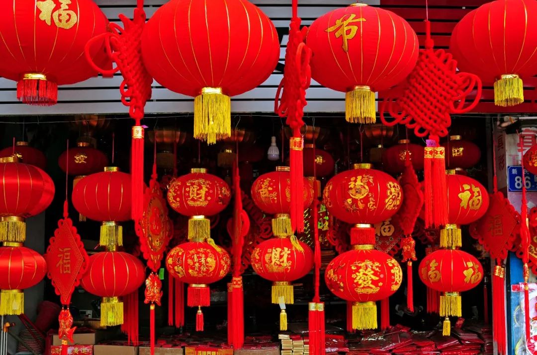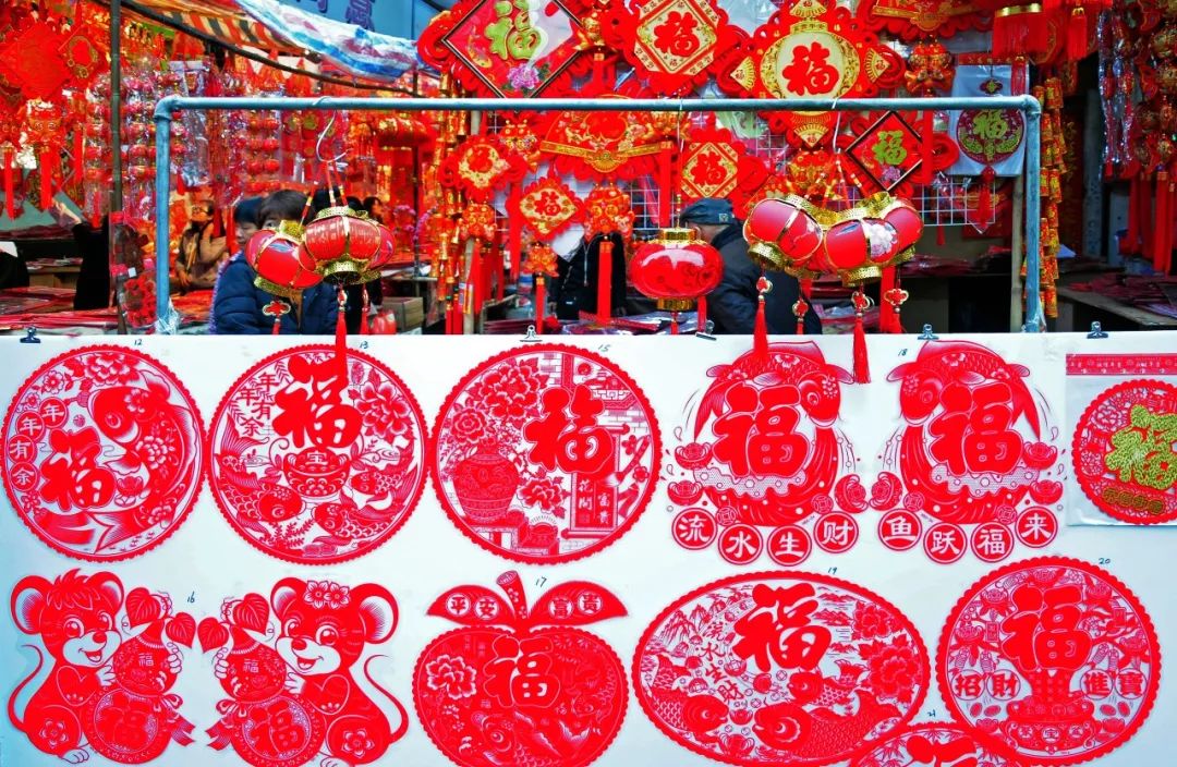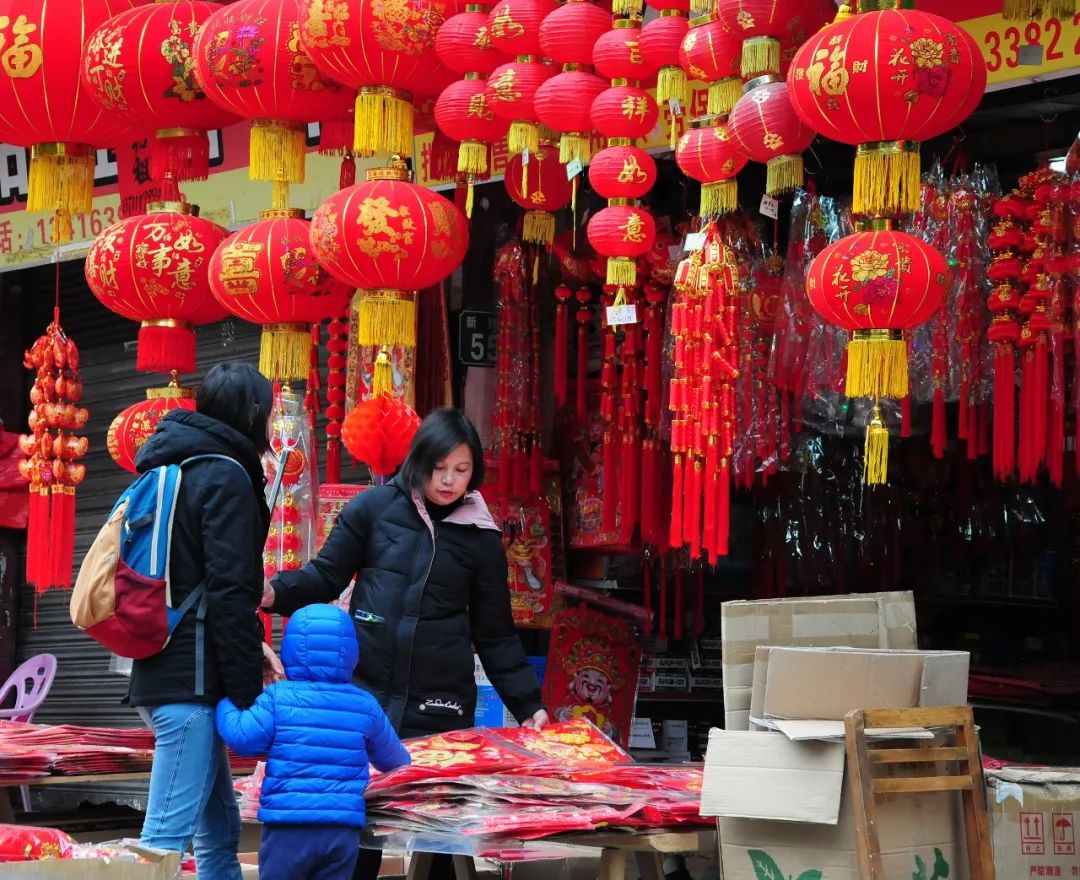 用鲜花、福字、鞭炮等饰品摆设新春景观