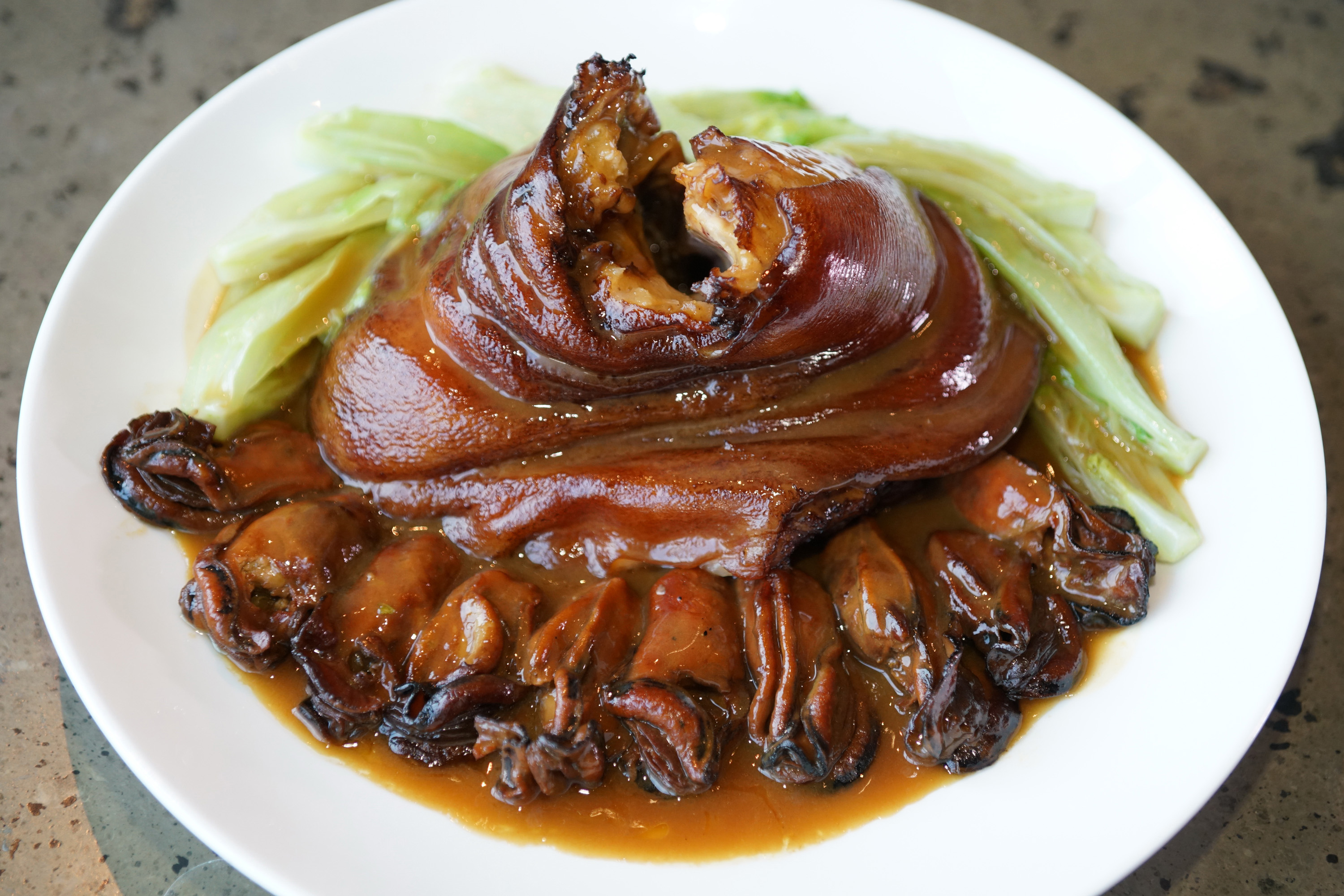 圆蹄经过慢炖以后非常柔软,感觉满满胶原蛋白,没有过多的油腻感,而且足够入味。金蚝有浓郁的海味香,配搭爽脆的生菜,口感上有很好的平衡。