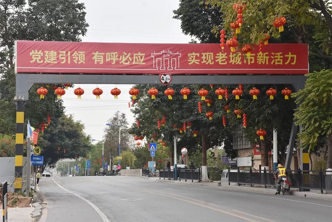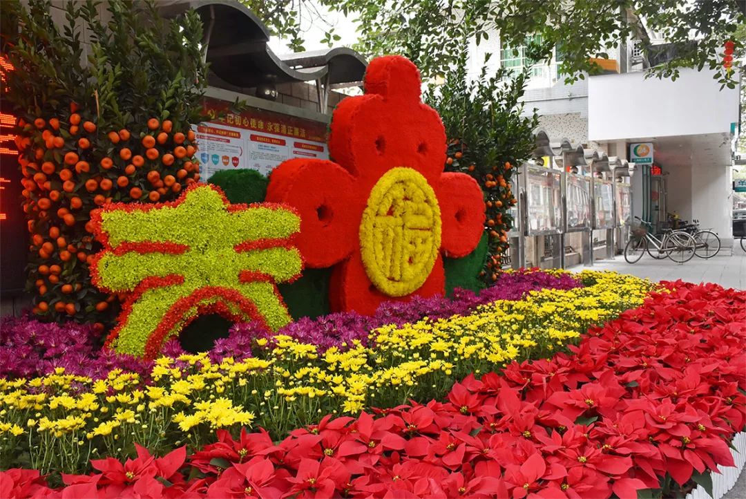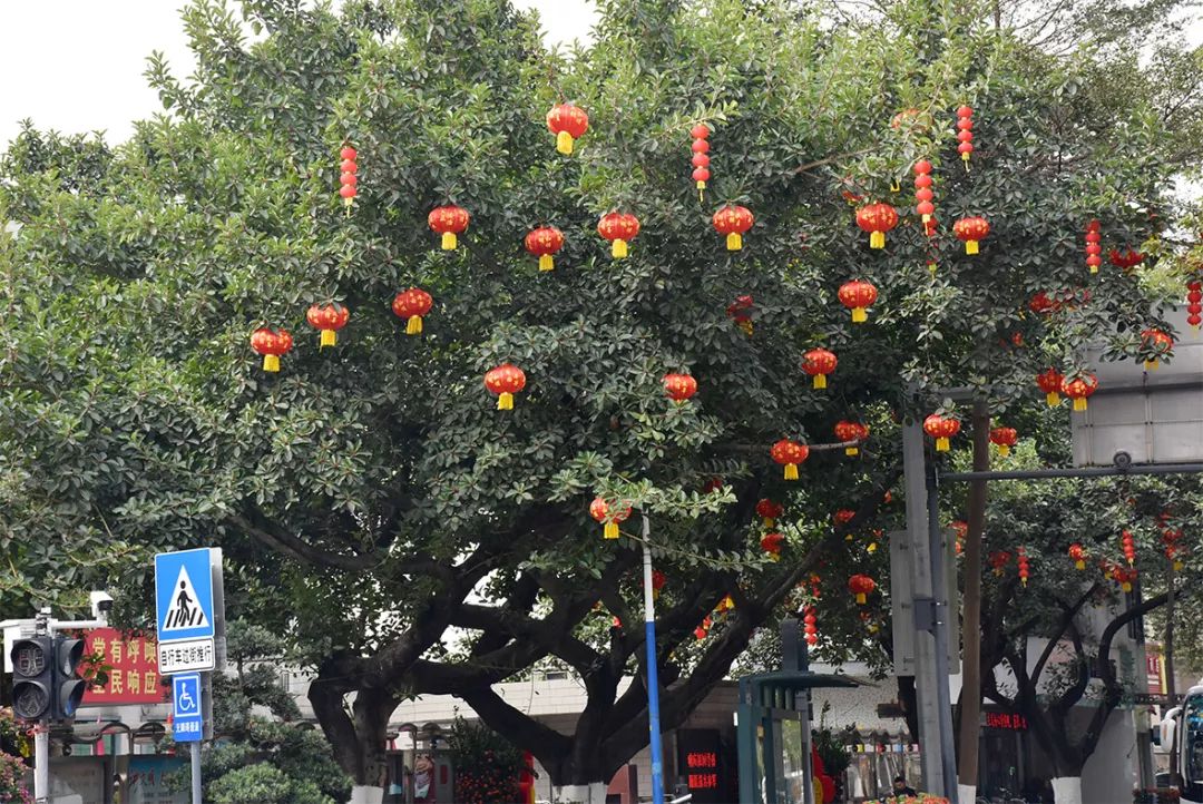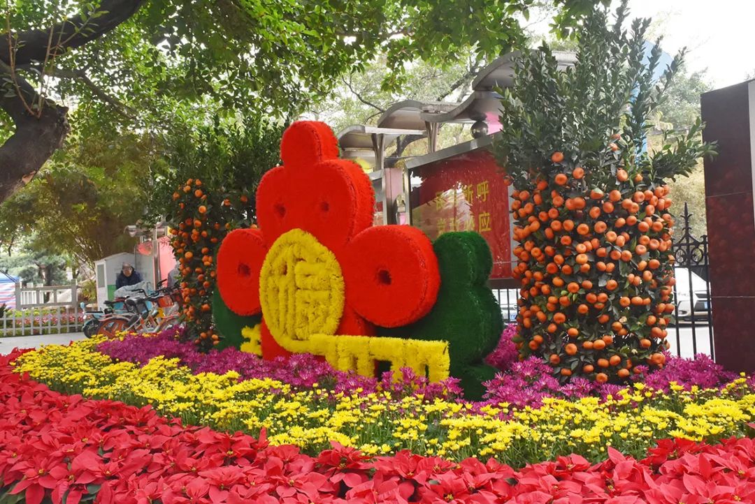 除了火红的灯笼,在赤坎桥、三角亭、街道办、长洲码头的显眼位置,各种迎春造型这两天也陆续布置完成。