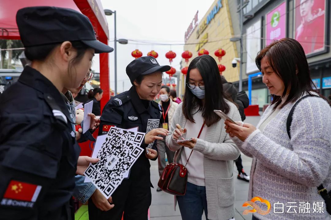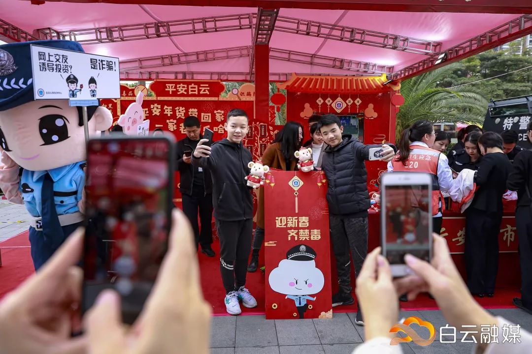 在花市首次设置的云安主题宣传展位,众多市民排着队,和民警卡通人物合影,并进行有奖问答、红包树、幸运转盘等游戏互动,回答正确则可以获得相应的有公安元素的定制奖品。民警则在互动过程中向市民宣讲扫黑除恶、禁毒、反诈骗等知识。