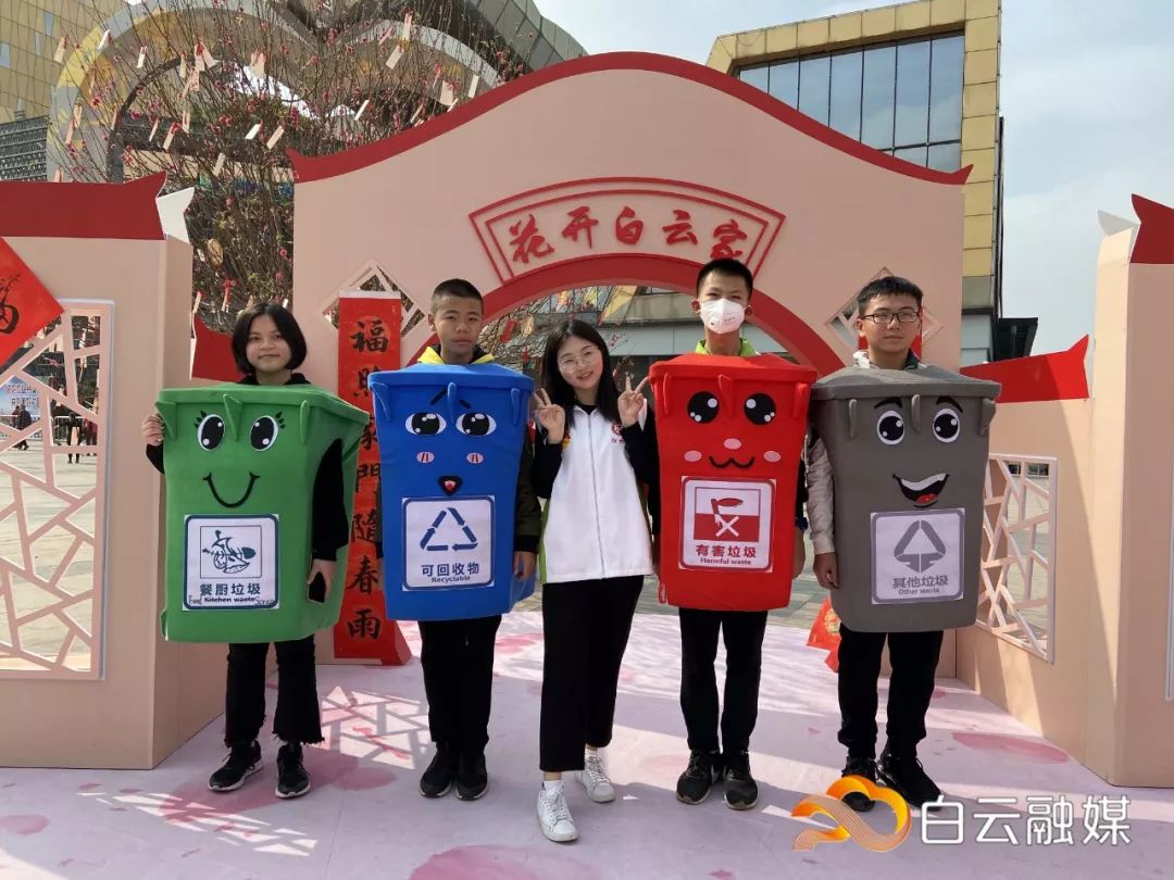今年花市还设置有垃圾分类宣传栏、云城街垃圾分类宣传摊位等,宣传垃圾分类。在花市志愿服务宣传区,还有志愿者身穿四色垃圾桶卡通服,充当起行走的垃圾分类“宣传栏”;